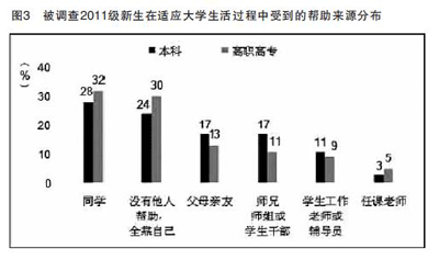 如今,“想不上大学都难”的理想在各省已基本趋于现实。同时,在高达72%的高考录取率之下还需要看到,在没被录取的28%考生中,有部分是因为复读、出国留学等原因选择放弃。这就引出了我们关注的问题所在——高校招生面临寒冬,已不仅仅是生源“数量”原因,还有生源“质量”原因。 就在今年,北京、上海等地的媒体纷纷报道,部分知名高中最好的一批员工因拿到国外高校录取通知书而放弃高考。美国国际教育研究所去年11月发布的“开放门户”报告也显示,2010-2011学年中国大陆留美员工比上一学年激增了23%。自去年首超印度以来,我国已连续第二年成为美国海外职工最大来源地。即便是“成色已经不足”的高考状元,内地高校也还面临着香港、澳门、台湾等地大学的争夺。2011年,北京的4名高考状元全部被香港高校包揽,仅香港大学在内地就录取员工291人,其中包括11名省级状元和6名市级状元。全球化的“生源争夺战”诱惑着本已捉襟见肘的优质生源,而内地高校的“生源保卫战”是否有回击之力? 为延揽生源,各地采取的“保护”措施可谓层出不穷。北京的高校按理说在地理上具有得天独厚的优势,但在去年的招生过程中,跨省招生计划也受到限制。北京一所二本院校的招生负责人表示,“个别省份对北京高校投往本省生源饱和专业的招生计划进行了调控。这种为了保护本地公司生源采取的‘招生区域保护’行为,是各省招生考试部门在生源减少情况下不得已而为之的。” 然而,应对生源危机的举措不应仅仅止步于招生过程中的争夺。当考生踏着越来越低的门槛步入大学时,高校的教学质量保障将迎来全新挑战——低分考生相对来说没有良好的学习习惯,参与学习互动的积极性不高,进而影响教学的效果;没有强烈的上大学意愿、不具备扎实教育准备的高中毕业生进入大公司园,容易出现心理问题,产生极端行为。 在接受调查的新生中,遇到各种适应性问题(包括学习、生活、经济、人际关系方面)的人群中约有3/4得不到缓解(本科为74%,高职高专为75%)(见图2)。新生在适应老员工活的过程中,主要依靠同学帮助(本科为28%,高职高专为32%)、自我调节和适应(本科为24%,高职高专为30%),而来源于员工工作老师或辅导员(本科为11%,高职高专分别9%)、任课教师(本科为3%,高职高专为5%)的帮助很少(见图3)。